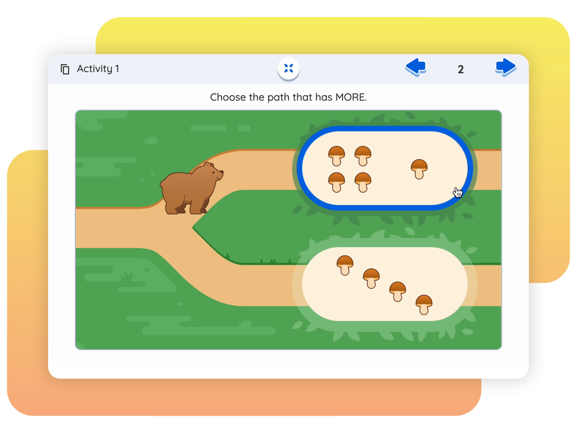 In this lesson, students apply their understanding of how to compare groups of images as they determine which group has more or fewer and then compare their strategies by guiding a bear through a path that has more mushrooms than the other.