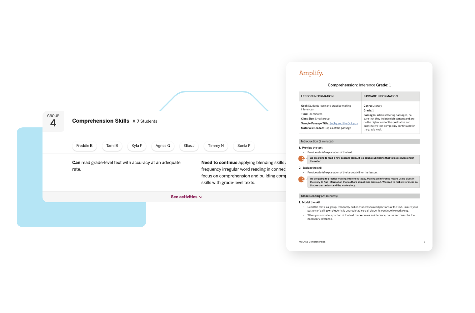mCLASS helps you make sense of data by instantly providing targeted instructional recommendations and teacher resources based on students’ assessment results. mCLASS data also informs instruction within Amplify’s suite of intervention, personalized learning, and core programs grounded in the Science of Reading.